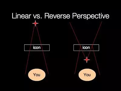 “In the pictures above the focal point is the red star. On the left is a linear perspective. Here the lines of convergence surround the viewer and converge on a focal point “within” the picture. This creates the effect we are all familiar with when looking at paintings, the sense of looking “through” the picture as if looking out a window. On the right is a reverse perspective. The focal point is “outside” the picture, placed on the observer. The lines of the picture move out from the picture to converge upon the viewer.” (Experimental Theology)