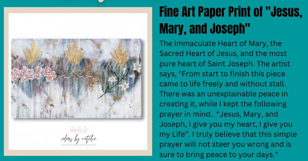 This beautiful, high quality 12×12″ print of Our Lady of Guadalupe was painted by Michigan, Catholic artist, Kristina Fahey. She hopes that the beauty and colors of this piece will help families, and especially children, to enter more deeply into the Liturgical season. As a Catholic artist, her passion is to allow the Holy Spirit to inspire and assist in her work. Ultimately, she desires to create beautiful, meaningful art for your sacred spaces, the sanctuaries you create for your families and children. Kristina is the wife of Paul and mom of 5, and she paints with watercolors at her kitchen table, right in the middle of the chaos of family life. Use Discount Code: GRATEFUL – for 15% off any order! SHOP NOW!