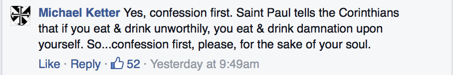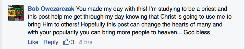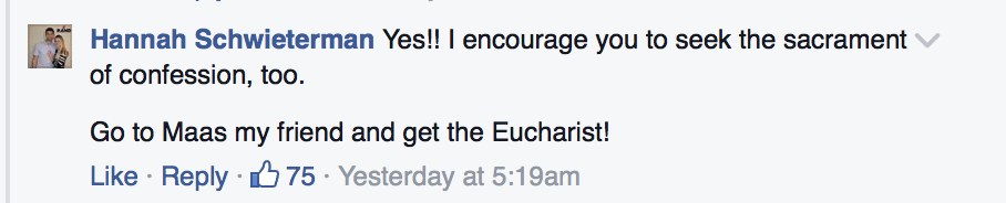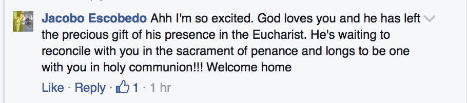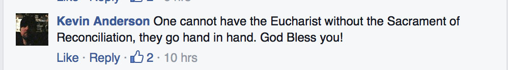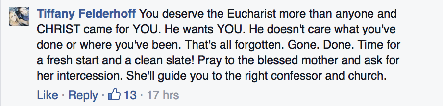 Take a look at a few of the comments made on Lady Gaga’s Facebook post. Right or wrong, she definitely got people talking about the Eucharist and for this, we should be thankful! The first comment below is particularly touching.