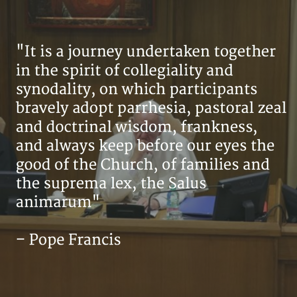 Pope Francis said, “the Church today takes up once again the dialogue begun with the announcement of the extraordinary Synod on the family, and certainly even long before that, to evaluate and reflect on the text of the Working Document (Lt. Instrumentum laboris), elaborated on the basis of the [Extraordinary Assembly’s] final report (Relatio Synodi) and the responses of the Bishops’ Conferences and from the other organizations with the right to contribute… The Synod moves necessarily within the bosom of the Church and of the holy people of God, to which we belong in the quality of shepherds – which is to say, as servants.”