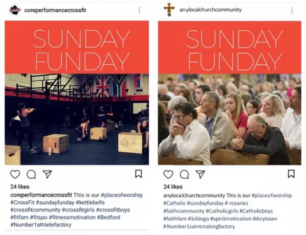 To conclude, then, have a look at the picture below, on the left. It’s from a recent Instagram post taken at my gym. For the record, I didn’t take it, and I don’t go to the gym on Sundays, but you can quickly see the point being made. Although there’s some fun in the deliberate comparison with going to church, there’s also a real seriousness to the idea: look at us, giving up our precious Sunday lie-ins; look at the commitment we’re making to our goals, while the ordinary man and woman are still in bed. We’re not your regular boys and girls, we’re Crossfit boys and girls – which, by implication, not only sets us apart from everyone else but clearly indicates the reason and manner we’re set apart.