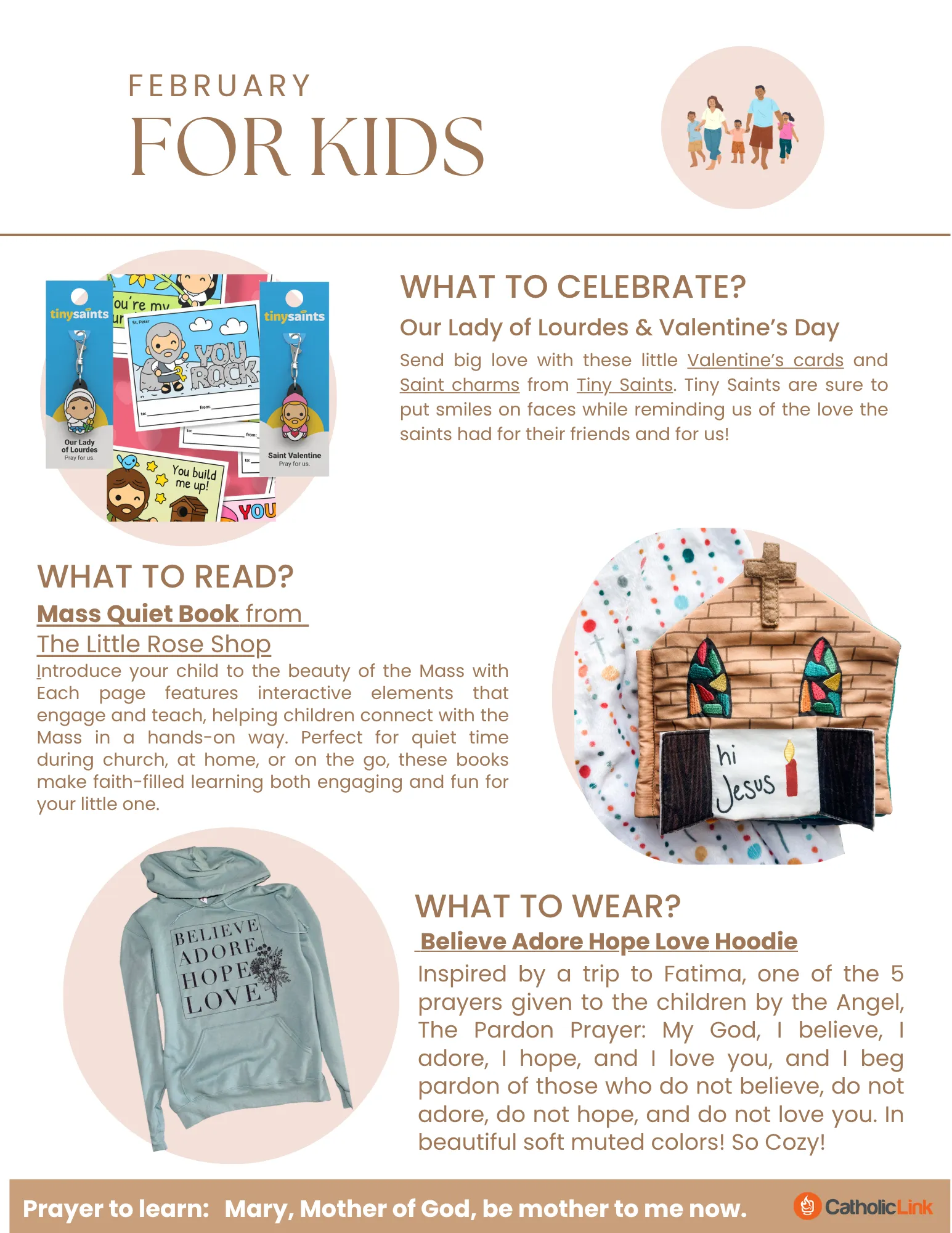 Links to purchase: Tiny Saints, Mass Quiet Book, Believe, Adore, Hope, Love, Hoodie