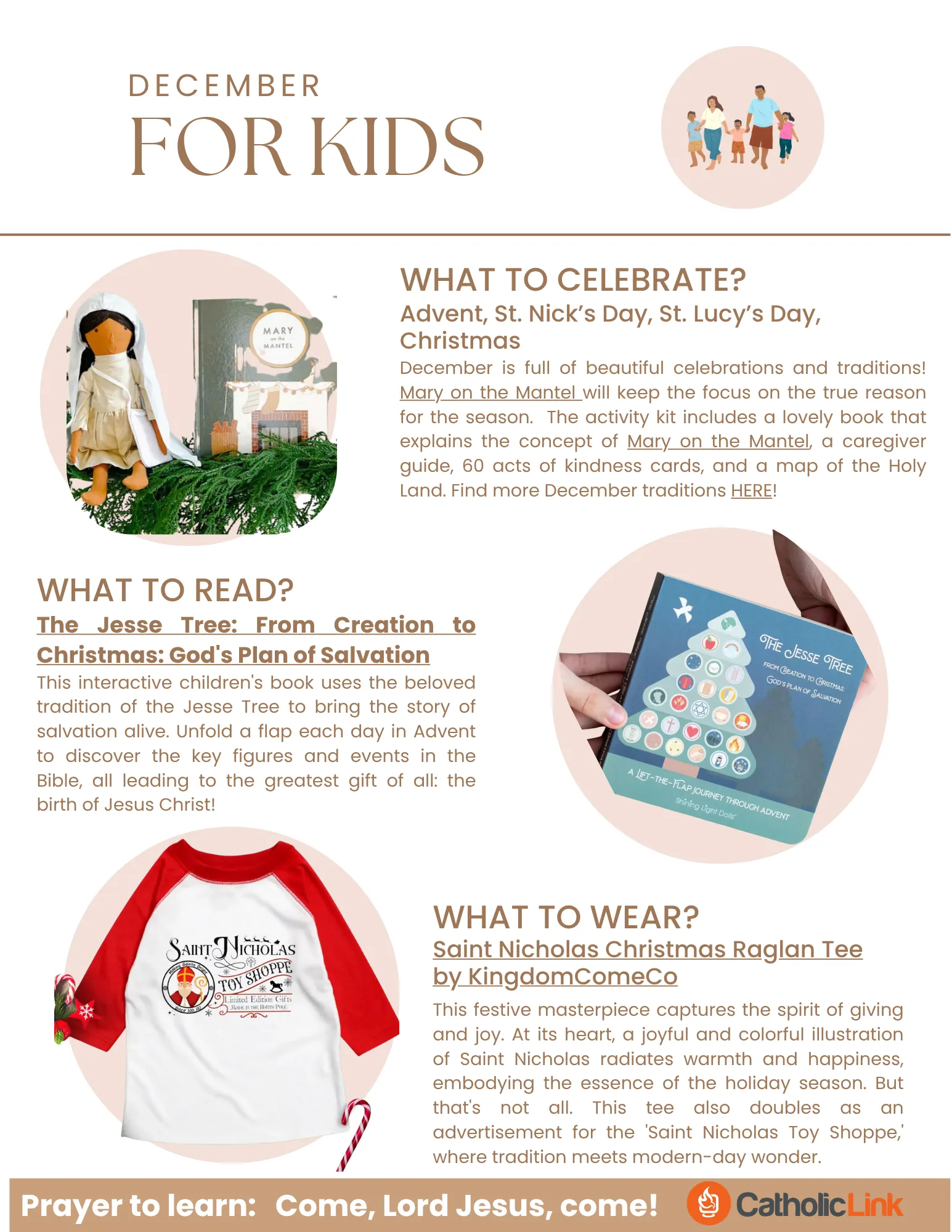 Links to purchase: Mary on the Mantle, The Jesse Tree book, Saint Nicholas Christmas t-shirt