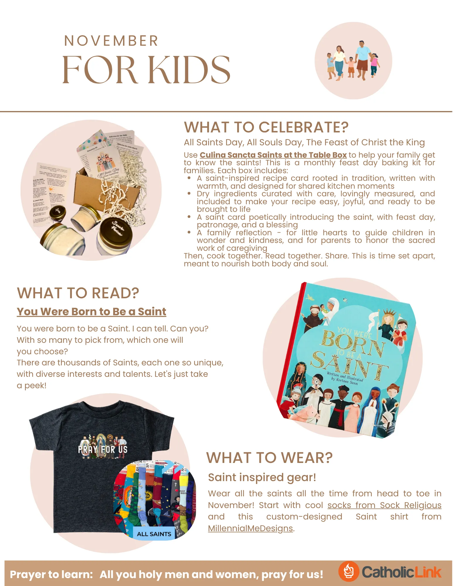 Links to purchase: Culina Sancta Saints at the Table Box, You Were Born to Be a Saint, Socks from Sock Religious, MillennialMeDesigns