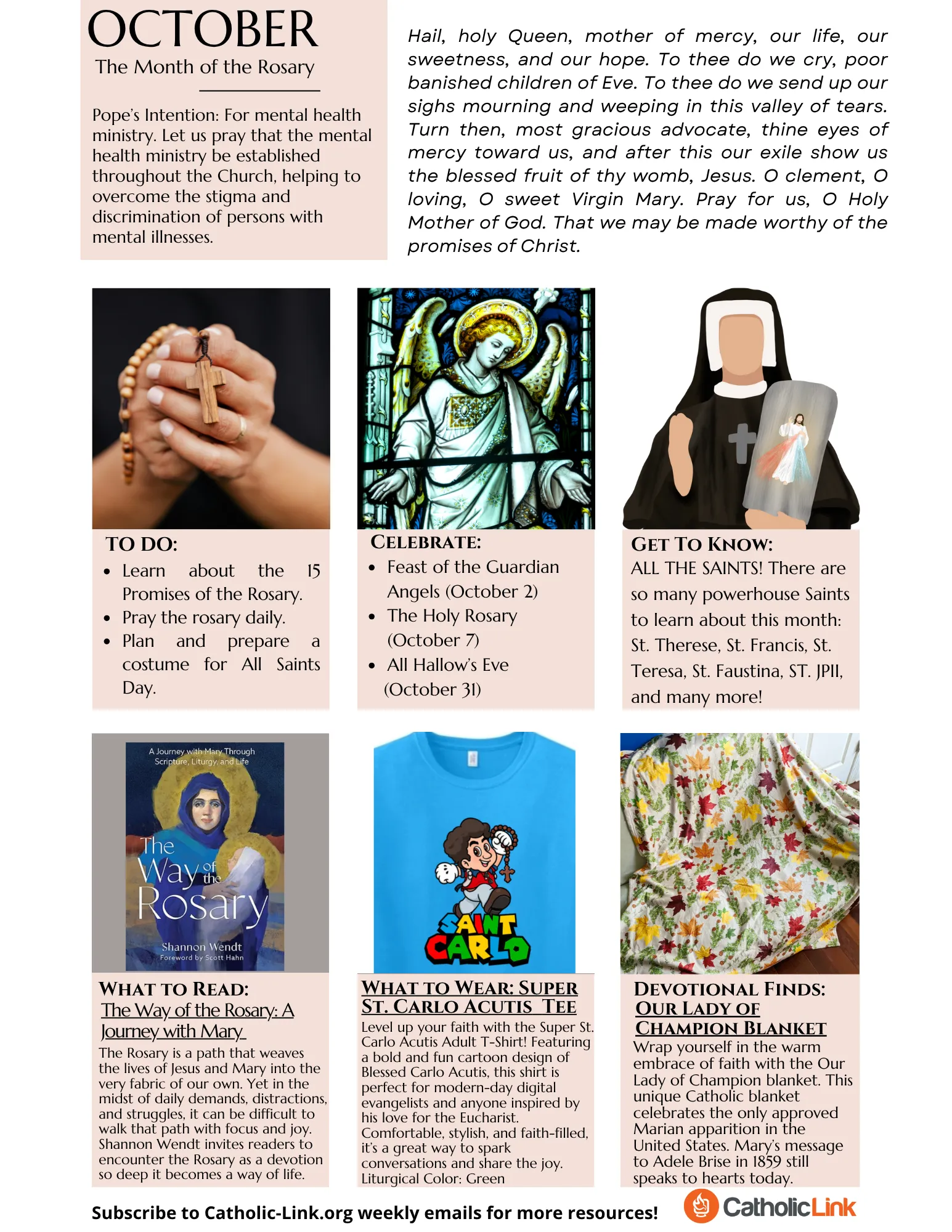 Links to purchase: The Way of the Rosary, St. Carlo T-shirt, Our Lady of Champion