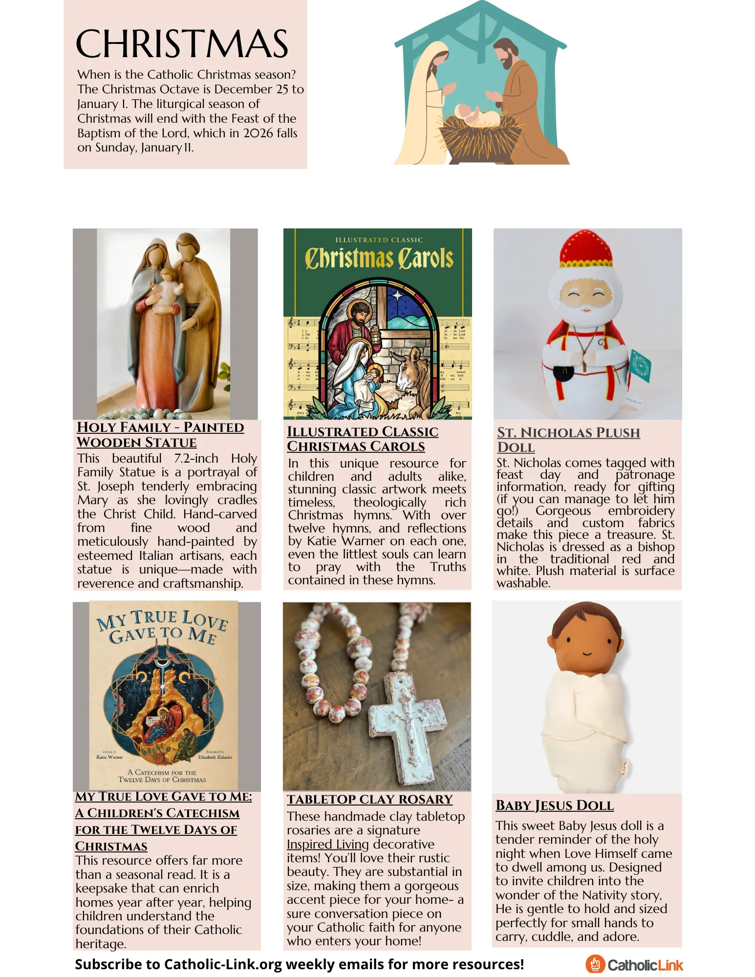 Links to purchase: Holy Family Painted Statue, Illustrated Classic Christmas Carols, St. Nicholas Plush Doll, My True Love Gave To Me, Epiphany House Blessing Kit, Jesus Baby Doll