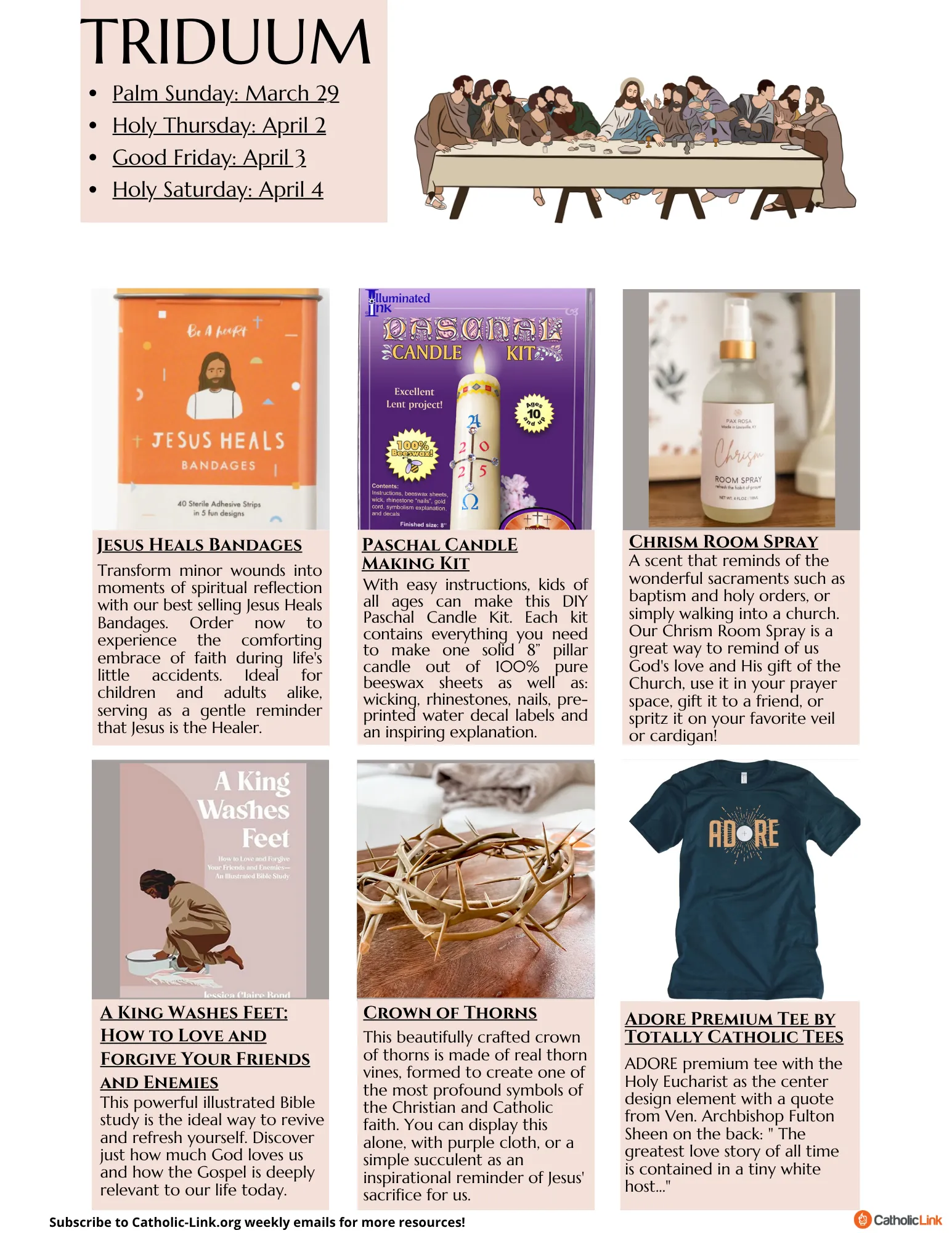 Links to purchase: Jesus Heals Bandages, Paschal Candle Making Kit, Chrism Room Spray, When We Go To Mass, Crown Of Thorns, Adore Tee By Totally Catholic Tees