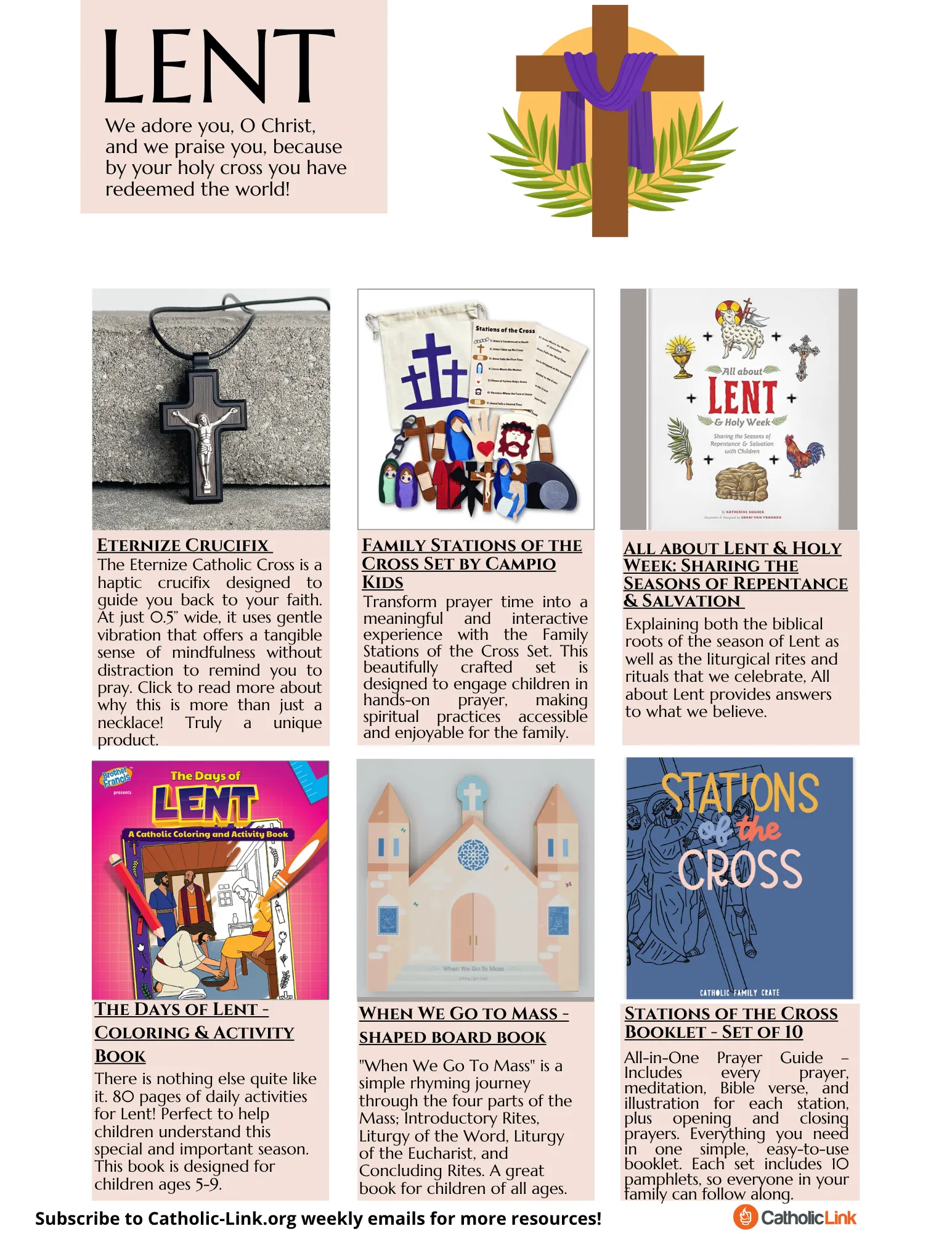 Links to purchase: Eternize Crucifix, Family Stations of the Cross, All About Lent, The Days of Lent Coloring & Activity Book, A King Washes Feet, Stations of the Cross