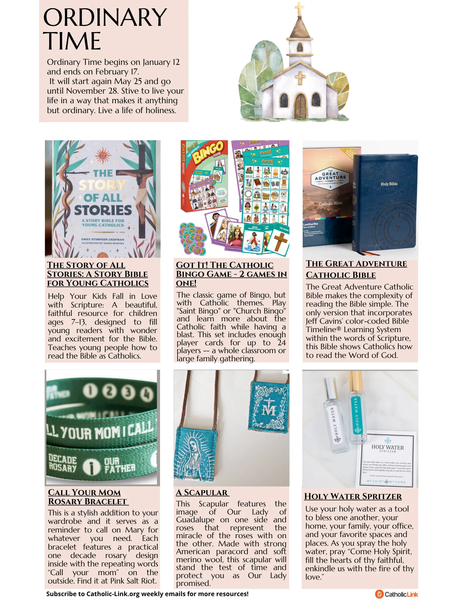Links to purchase: The Story of All Stories: A Story Bible for Young Catholics, Got It! The Catholic Bingo Game, The Great Adventure Catholic Bible, Call Your Mom Rosary Bracelet, Scapular, Holy Water Spitzer