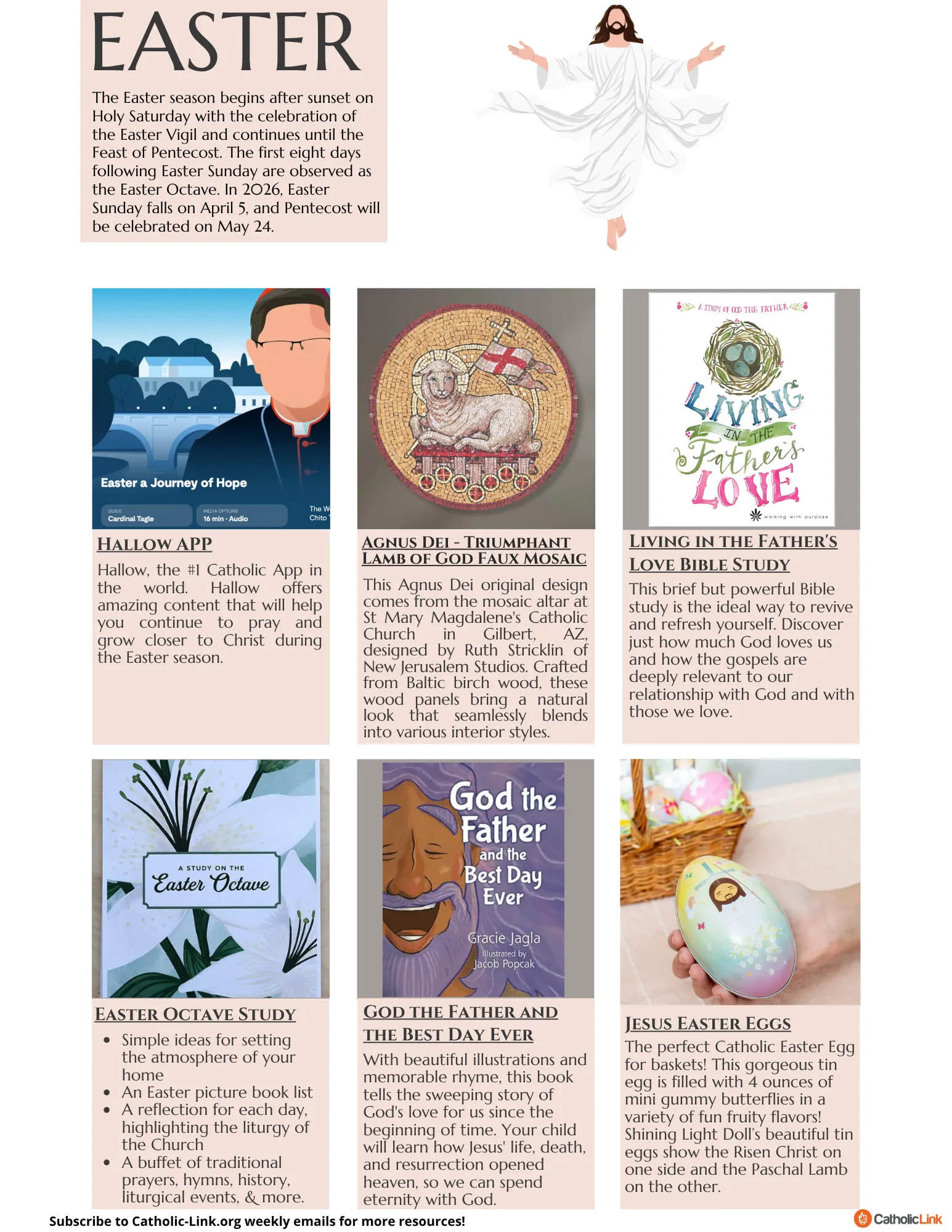 Links to purchase: Hallow, Agnus Dei Faux Mosaic, Living In The Father’s Love Bible Study, Easter Octave Study from Into the Deep, God the Father and the Best Day Ever, Jesus Easter Eggs