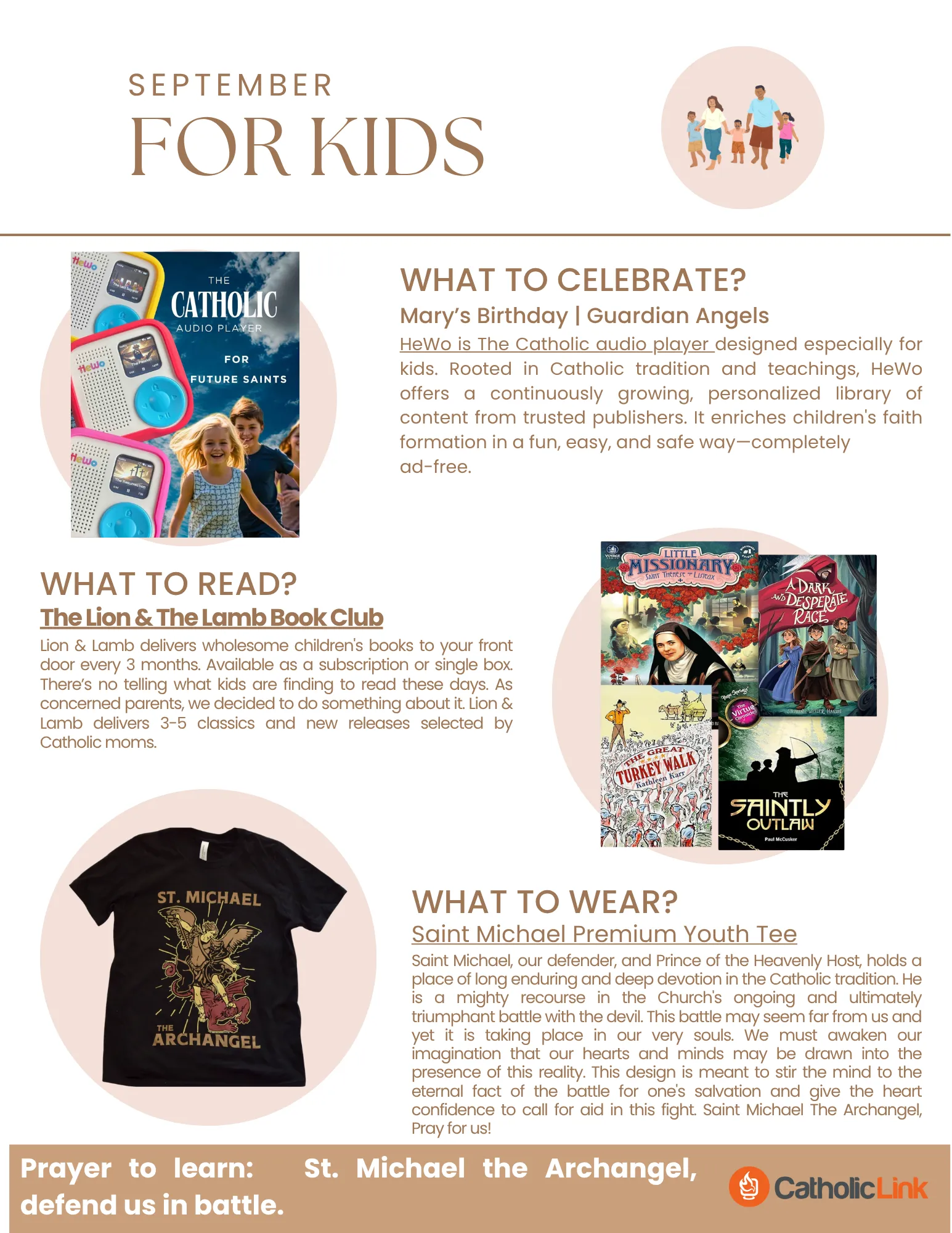 Links to purchase: HeWo, The Lion & The Lamb Book Club, St. Michael t-shirt from Totally Catholic Tees
