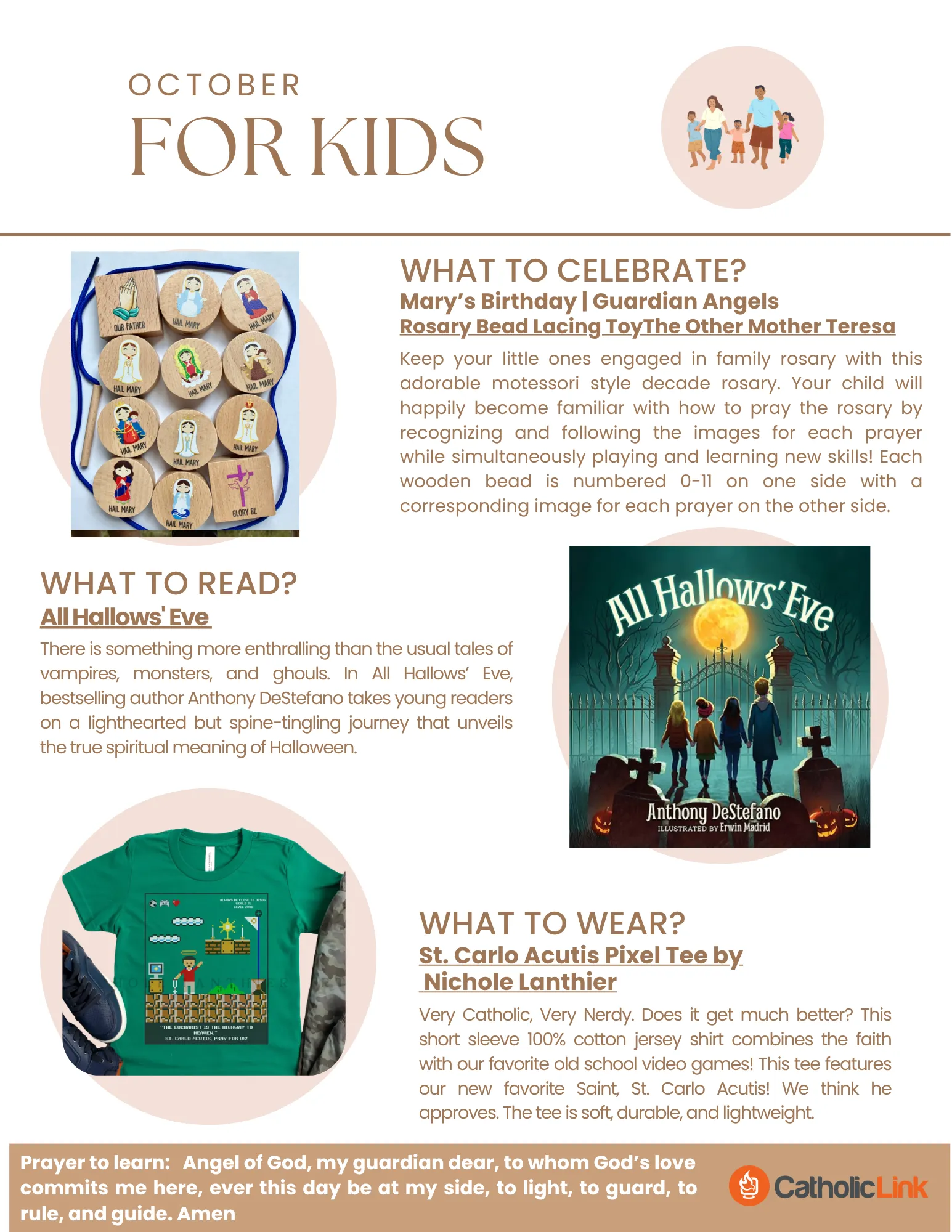 Links to purchase: Rosary Bead Lacing Toy, All Hallows’ Eve, St. Carlo Acutis Pixel Tee by Nichole Lanthier
