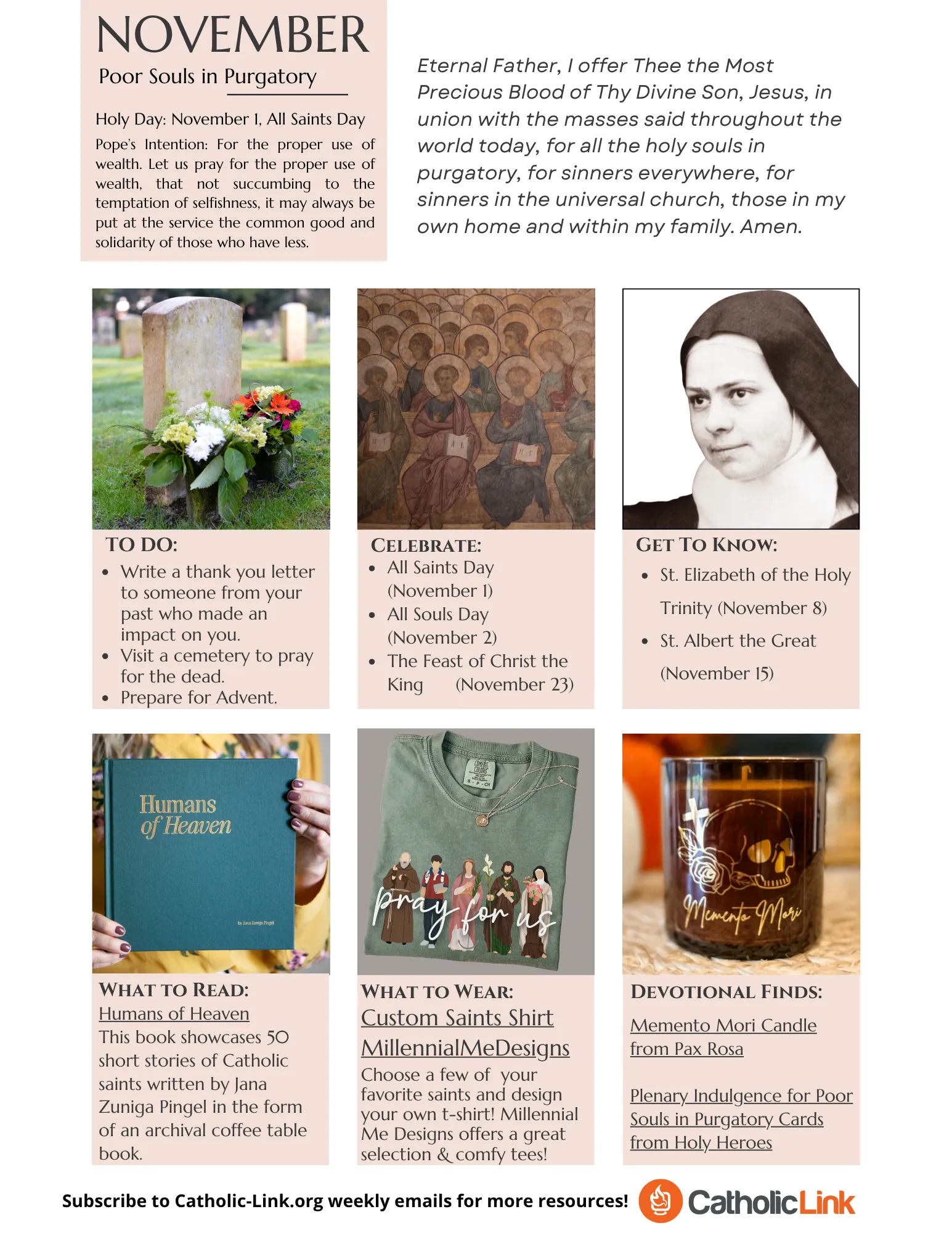 Links to purchase: Humans of Heaven, Millennial Me Designs Custom Saint Shirt, Memento Mori Candle, Purgatory Cards from Holy Heroes
