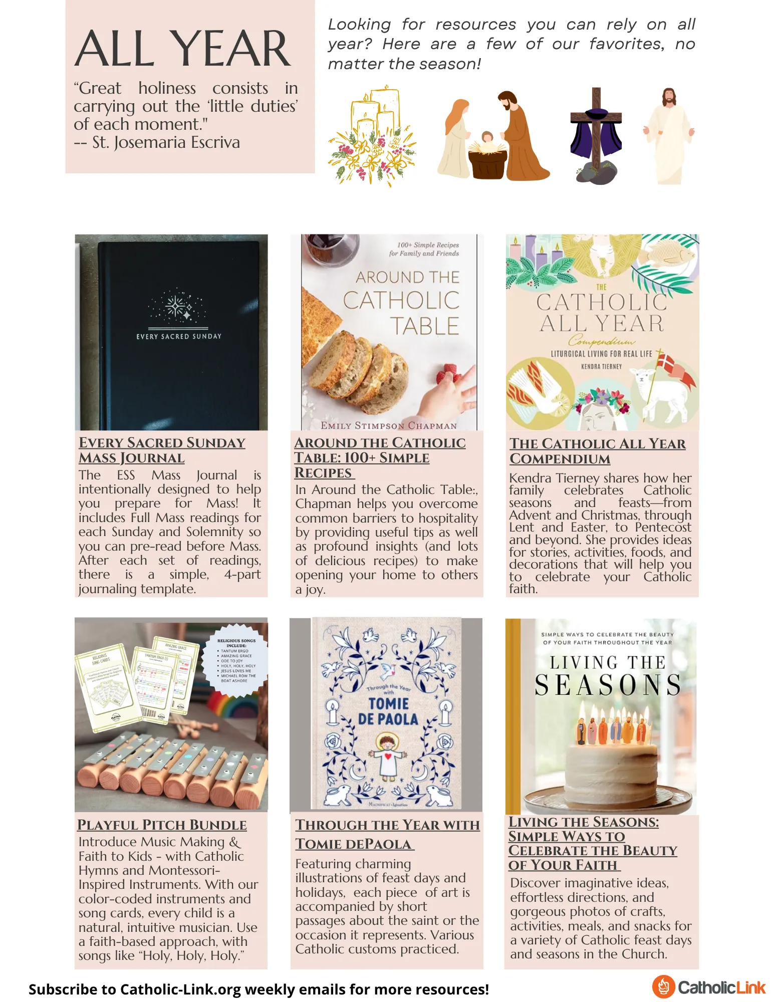 Links to purchase: Every Sacred Sunday, Around the Catholic Table: 100+ Simple Recipes, The Catholic All Year Compendium, Playful Pitch Bundle, Through the Year with Tomie dePaola, Living the Seasons: Simple Ways to Celebrate the Beauty of Your Faith