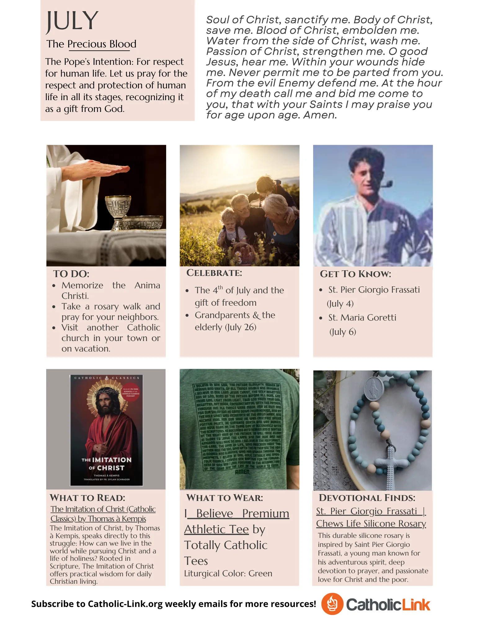 Links to purchase: The Imitation of Christ (Catholic Classics) by Thomas à Kempis, Believe Premium Athletic Tee, St. Pier Giorgio Frassati | Chews Life Silicone Rosary