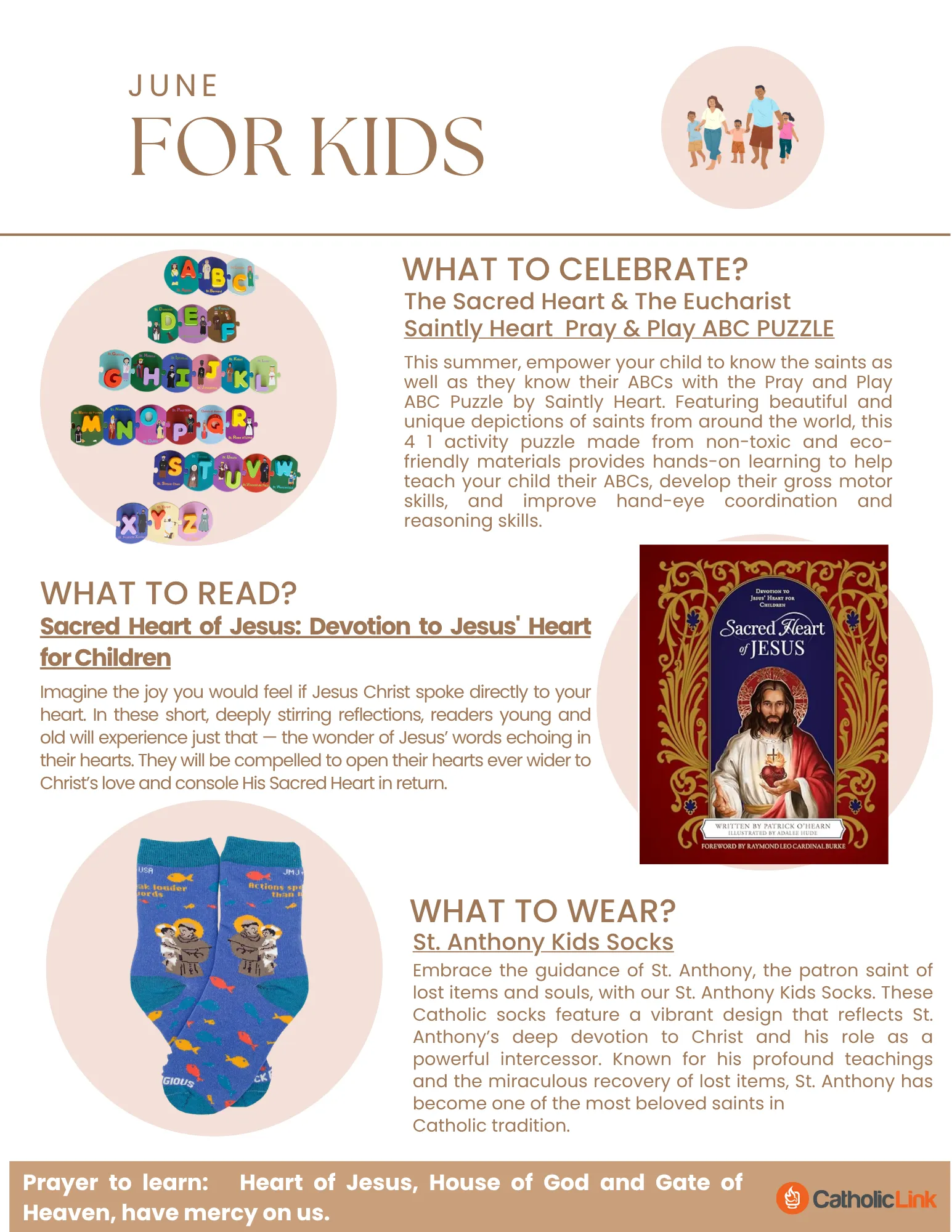 Links to purchase: Saintly Heart ABC Pray & Play Puzzle, Sacred Heart of Jesus: Devotion to Jesus’ Heart for Children, St. Anthony Kids Socks