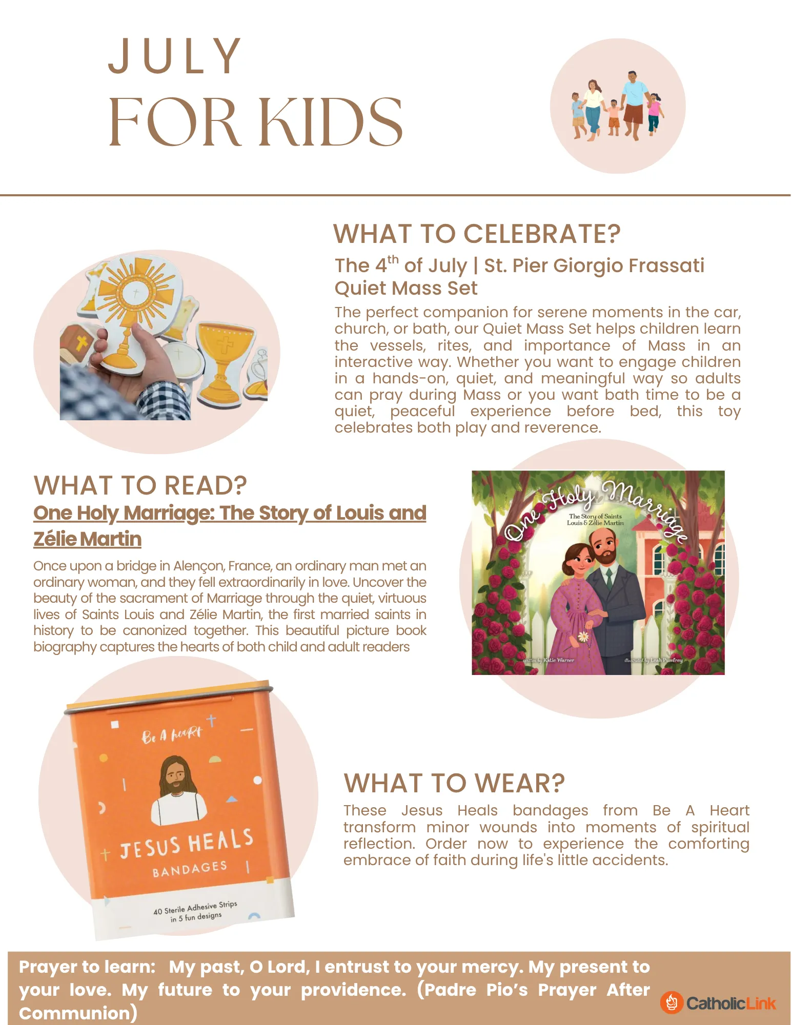 Links to purchase: Quiet Mass Set by Saintly Heart, One Holy Marriage: the Story of Louis and Zelie Martin, Jesus Heals Bandages