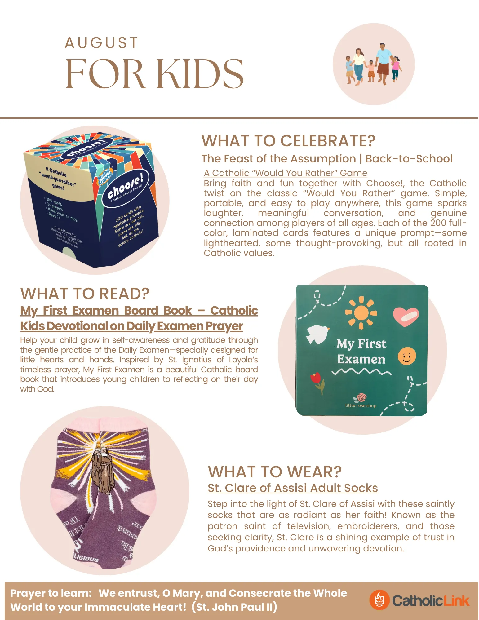 Links to purchase: Choose! A Catholic Would You Rather, My First Examen Board Book, St. Clare of Assisi Adult Socks