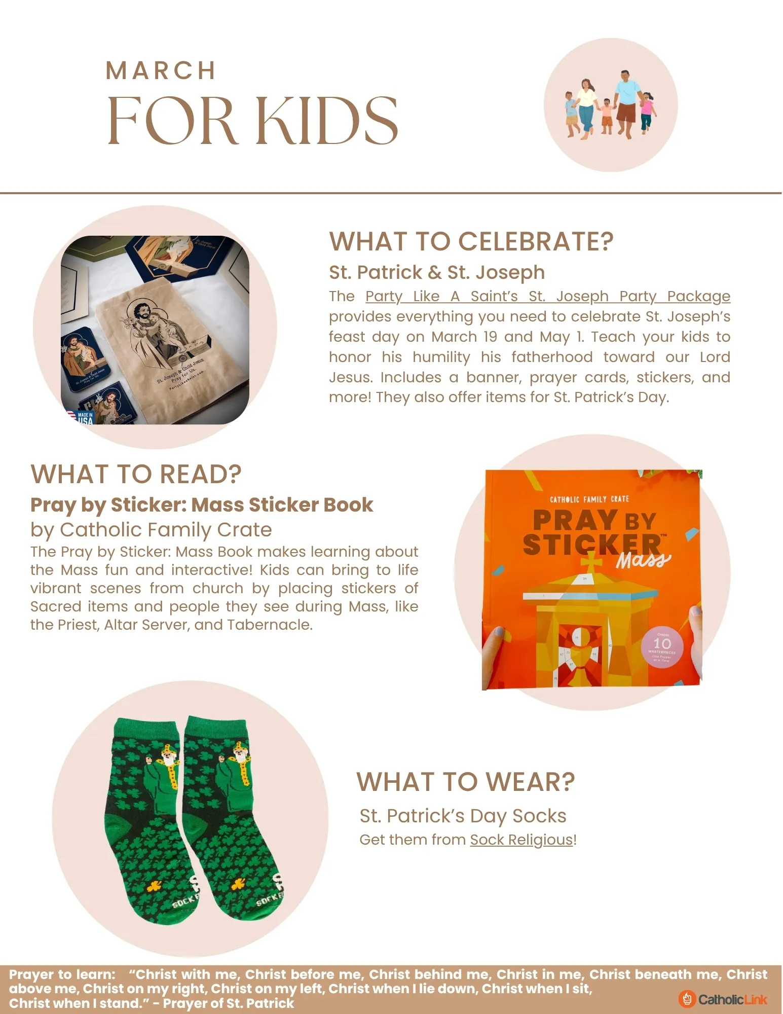 Links to purchase: Party Like A Saint St. Joseph Package, Pray By Sticker, St. Patrick’s Day Socks