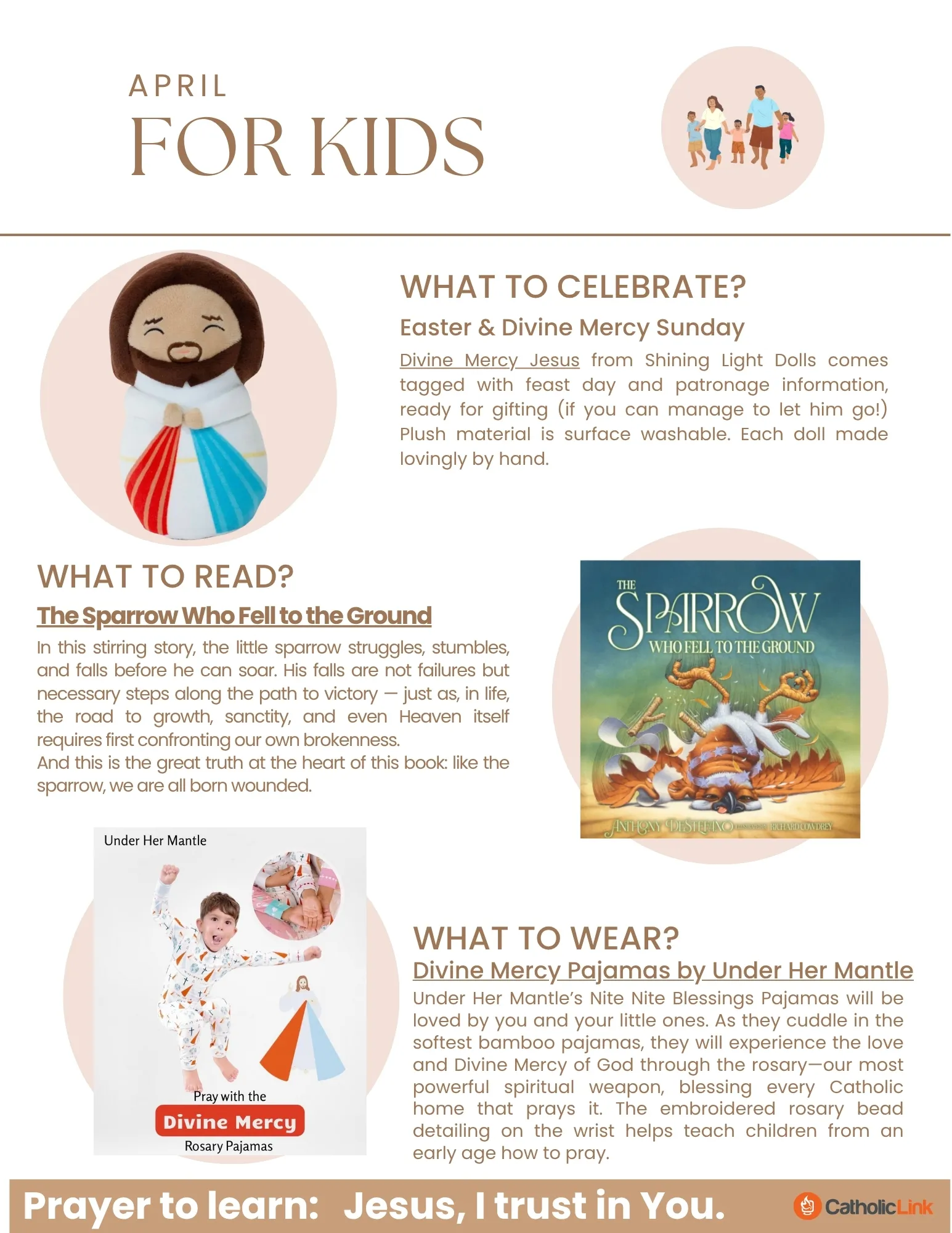 Links to purchase: Divine Mercy Plush, The Sparrow Who Fell to the Ground, Divine Mercy Pajamas by Under Her Mantle