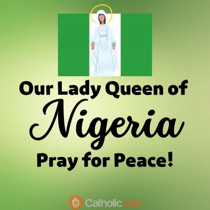 We fly to the patronage, O holy Mother of God. Despise not our petitions in our necessities, but deliver us always from all dangers. O ever glorious and blessed Virgin. Our Lady Queen of Nigeria, pray for us!