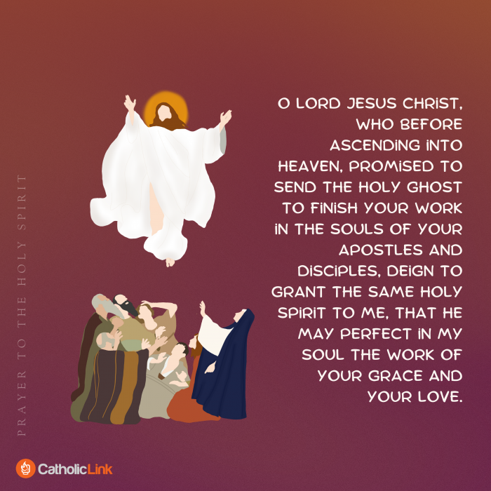 O Lord Jesus Christ, Who, before ascending into heaven, did promise to send the Holy Spirit to finish Your work in the souls of Your Apostles and Disciples, deign to grant the same Holy Spirit to me that He may perfect in my soul, the work of Your grace and Your love. Grant me the Spirit of Wisdom that I may despise the perishable things of this world and aspire only after the things that are eternal, the Spirit of Understanding to enlighten my mind with the light of Your divine truth, the Spirit of Counsel that I may ever choose the surest way of pleasing God and gaining heaven, the Spirit of Fortitude that I may bear my cross with You and that I may overcome with courage all the obstacles that oppose my salvation, the Spirit of Knowledge that I may know God and know myself and grow perfect in the science of the Saints, the Spirit of Piety that I may find the service of God sweet and amiable, and the Spirit of Fear that I may be filled with a loving reverence towards God and may dread in any way to displease Him. Mark me, dear Lord, with the sign of Your true disciples and animate me in all things with Your Spirit. Amen.