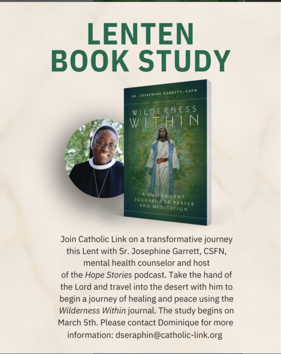 Join Catholic Link on a transformative journey with Sr. Josephine’s Garrett’s Lenten devotional, Wilderness Within: A Guided Lent Journal for Prayer and Meditation. With the help of written meditations and video reflections, Sr. Josephine encourages us to respond to the Lord’s call of healing and intimacy with him. The Lord Jesus stands at the door of our hearts, gently knocking, that we might invite him in. In opening ourselves up and experiencing his healing, our souls will-be prepared to meet the resurrected Christ on Easter Sunday. This journey will help you gather more of your heart up into your hands and offer it to Jesus to enter into, to reign in, to be used for the service of his kingdom, and to be a source of the same divine life that flows from his own Sacred Heart.
